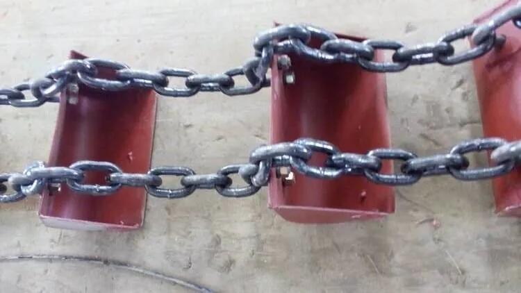 環(huán)鏈?zhǔn)禽^常用的一種牽引件,它的結(jié)構(gòu)和制造比較簡(jiǎn)單,與料料的鏈接也很牢固。但環(huán)鏈相互接觸處易磨損,降低鏈的強(qiáng)度,且運(yùn)行不夠平穩(wěn)。
