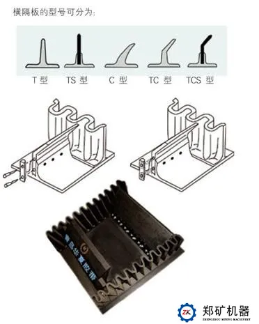 輸送帶為擋邊帶,擋邊帶由基帶、擋邊和隔板組成,基帶的外觀與普通輸送帶相同,但具有更大的橫向剛度。擋邊做成波狀是為了使輸送帶能繞過各滾筒凸、凹弧區(qū)段,以滿足輸送線路的要求。波紋的形狀可以是正弦波、方波、W形波等。在兩擋邊之間的基帶上,有按一定間距布置的隔板。隔板按其不同的斷面可分為T型、TS型、C型、TC型、TCS型。