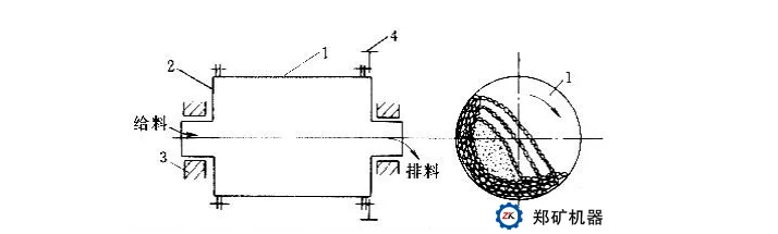 如下圖其工作原理如下: 圓柱形筒體1、端蓋2、軸承3、傳動(dòng)大齒圈4等部件,筒體1內(nèi)裝入直徑為25-150mm的鋼球或鋼棒,稱為磨介,其裝入量為整個(gè)筒體有效容積的25%-50%。筒體兩端有端蓋2,端蓋利用螺栓與筒體端部法蘭相連接,端蓋的中部有孔,稱為中空軸,中空軸支承在軸承3上,筒體可以轉(zhuǎn)動(dòng)。筒體上還固定有大齒輪圈4。在驅(qū)動(dòng)系統(tǒng)中,電動(dòng)機(jī)通過(guò)聯(lián)軸器、減速器和小齒輪帶動(dòng)大齒輪圈和筒體,緩緩轉(zhuǎn)動(dòng)。當(dāng)筒體轉(zhuǎn)動(dòng)時(shí),磨介隨筒壁上升至一定高度,然后呈拋物線落下或?yàn)a落而下。由于端蓋上有中空軸,物料從左方的中空軸給入筒體,并逐漸向右方擴(kuò)散移動(dòng),當(dāng)物料自左向右的移動(dòng)過(guò)程中,旋轉(zhuǎn)筒體將鋼球帶至一定高度而落下將物料擊碎,而一部分鋼球在筒體成瀉落狀態(tài)對(duì)物料有研磨作用,整個(gè)移動(dòng)過(guò)程也是物料的粉碎過(guò)程。